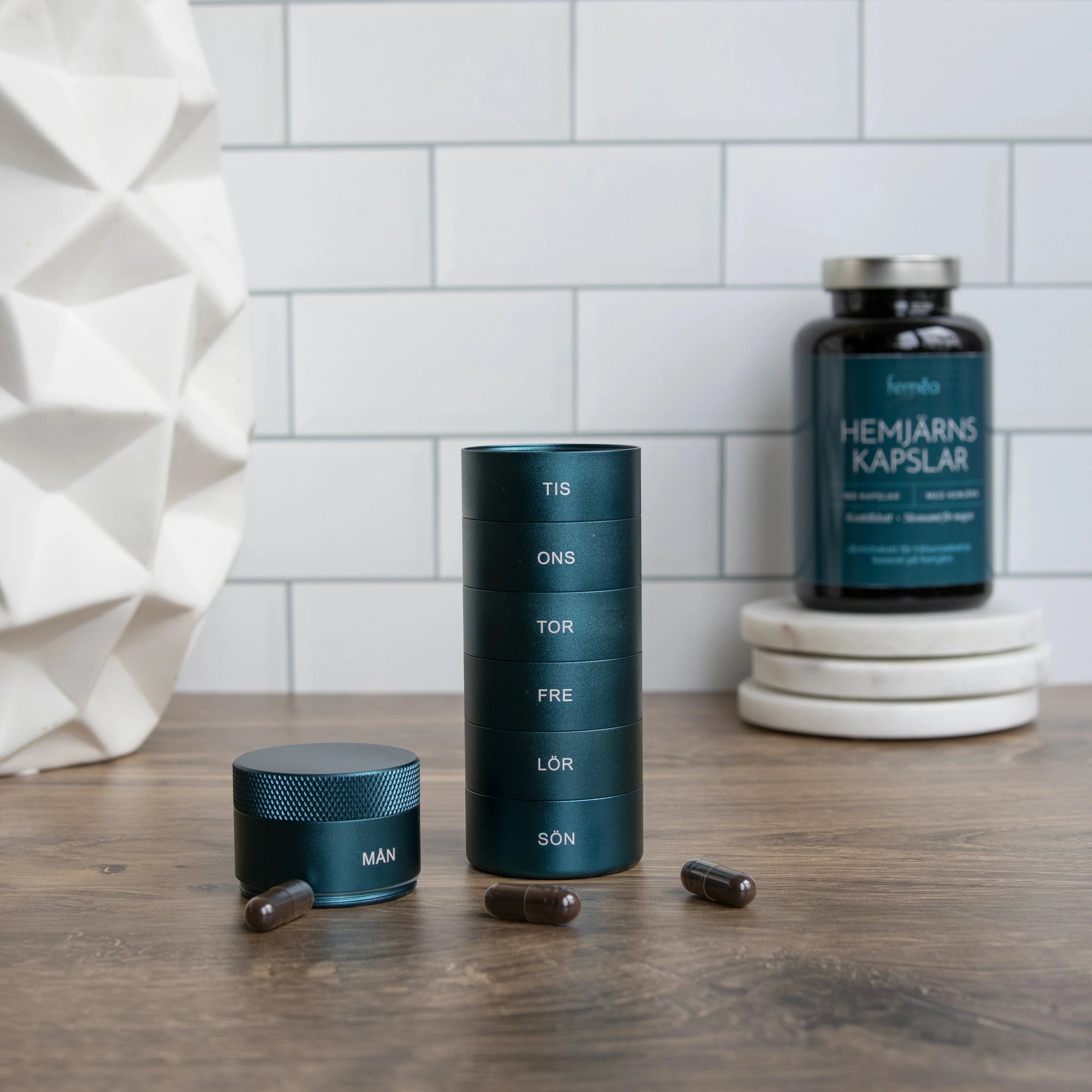 Organisera veckans intag av hemjärnskapslar på ett stilrent och smidigt sätt med vår doseringstub - med plats för 8 st hemjärnskapslar per fack.